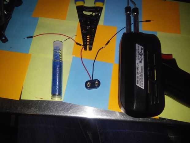 Pele los cables del adaptador de 9v y soldarlos a los extremos de los alambres de 20 calibre. Proceder a cinta el alambre expuesto. Si quieres saltar los alambres de 20 calibre y sólo los puede soldar a los cables del ventilador. Sin embargo, decidí no hacerlo en caso de elegir el ventilador de enfriamiento para volver a utilizar.