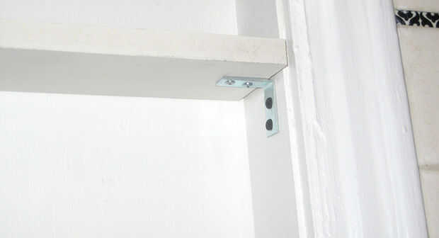 Añadir un soporte en "L" a los extremos de cada estante. A continuación, inserte el estante en el espacio. Tengo un amigo sostenga mientras que atornillar en su lugar. Cuando tienes un lado atornillado, nivel de la plataforma. Atornille el otro lado.