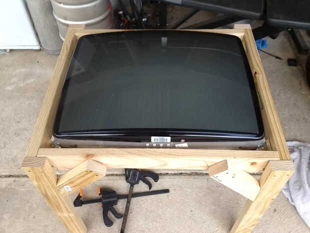 Decidí construir mi marco de madera gruesa y tenerlo así que el CRT simplemente "cayó". Comencé haciendo las medidas ásperas e hizo una mofa de rápida del marco. Un marco de rectángulo básico con algunos patas que parecía caber bien alrededor de la CRT. Pongo algunos bloques grandes de triángulo en las esquinas el los puntos de montaje se basaba en y empernada en.
