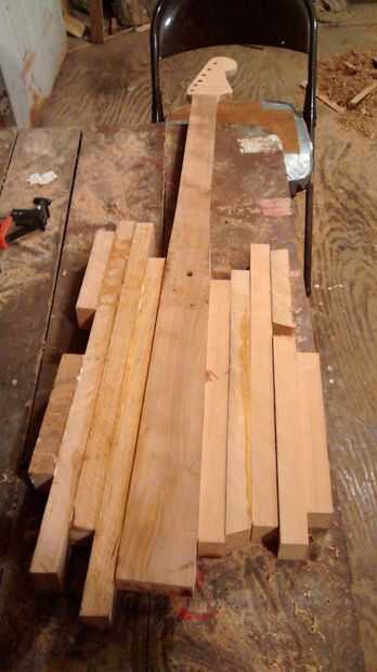 Lo que hice fue pegamento las tiras de madera juntos por cada lado del cuerpo, pegamento ésos juntos respectivamente, entonces pegué esas porciones al cuello. Usted podría terminar con algo que se parece un montón de bloques de Lego pegadas como llegué, o usted podría terminar para arriba con algo que se asemeja a la guitarra de Bo Diddley.