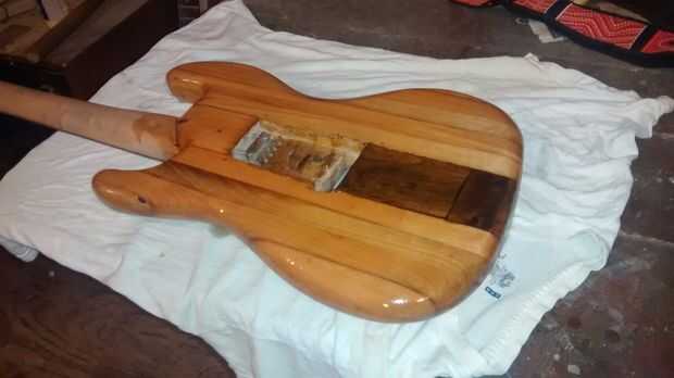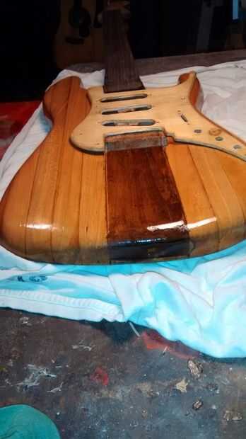 Ahora que las cavidades se forman, la armadura se pega en y la guardia de la selección se realiza, es tiempo de encolado del diapasón y terminar esta mala mama-jama.