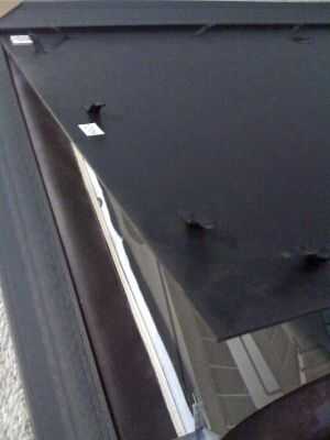 Alinee el soporte del bastidor contra uno de los bordes laterales.  (No la parte superior o inferior.)  Mantenga el respaldo en un ángulo con una mano y con la otra mano alcanzar bajo el respaldo y asegúrese de que las dos esquinas se acoplan bien.  Baje el respaldo plano contra el marco.  Mientras lo hace, asegúrese de que las otras dos esquinas están bien dobladas y aplanadas.  Con suerte ninguno de su desplazamiento de la pared se pico fuera de los bordes de la base.  Pasa nada si lo hace un poco, sin embargo.  Garantizar el apoyo a la estructura.