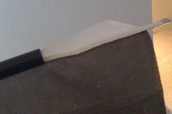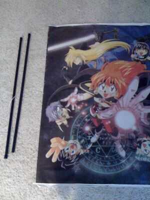 Eliminar las barras superior e inferior de su wallscroll.  NO CORTE EL WALLSCROLL.  En su lugar debe ser capaz de quitar el tapón plástico en un extremo de cada barra y deslice el wallscroll hacia fuera.  Usted notará que oculta en la barra es una tira de cartón que impide que el tejido deshilachado incluso cuando el wallscroll no está conectado a las barras.  La razón que no debe cortar su wallscroll es para evitar que se desgaste en los extremos.  Además, si guarda las barras usted puede reconstruir su wallscroll si no te gusta el aspecto de en el marco.