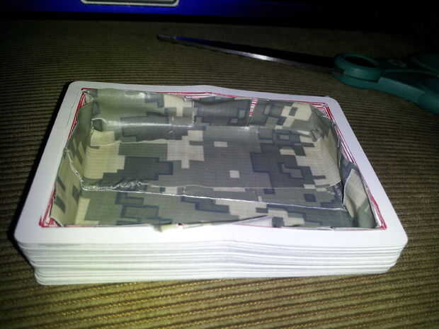 4. Corte unas tiras pequeñas de cinta adhesiva y llenar en el compartimiento, presionando la cinta en las esquinas. Recorte cualquier cinta que va por encima de la primera tarjeta. Usé un poco de pegamento para mantener la carta de arriba hacia abajo también, pero no es necesario.