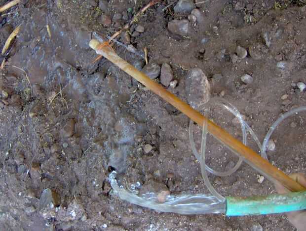 La manera inteligente para hacer esto es rellenando previamente el tubo de sifón, y la forma más sencilla que he encontrado para hacer esto es por relleno un extremo hacia abajo de una manguera de jardín funcionando. Esperar hasta que el flujo de fuerzas a todas las burbujas de aire. Este truco se muestra en la segunda foto.