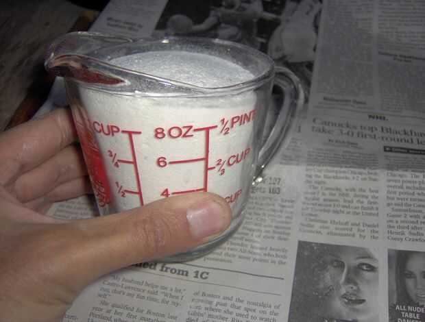 Transferir el jabón en polvo del periódico a la taza de medición, para hacer más fácil verter el jabón en polvo con una mano.
