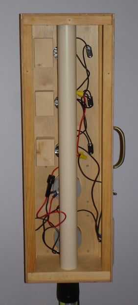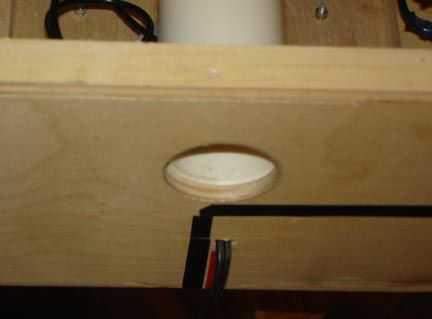 Usé 3/4 "x 5" Pino de la parte superior e inferior con agujeros perforados para un tubo de PVC de 1-1/2". Después de la instalación y el cableado de los metros, interruptores y tomas de corriente, instalar la tubería. Después de que el tubo está en su lugar, se instala la pieza superior de madera contrachapada de 1/4". Perfore un orificio de 1-3/8" en madera contrachapada de la parte inferior y fije. Esto mantendrá el tubo de PVC cautivo.