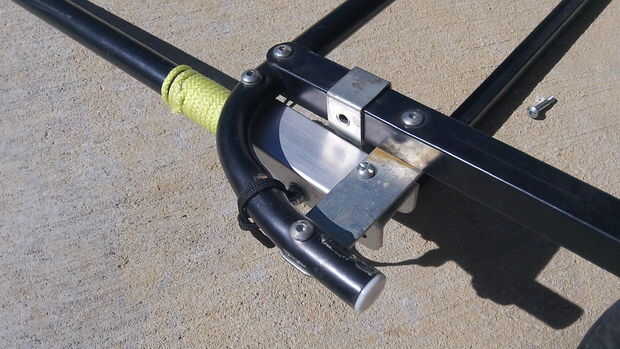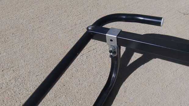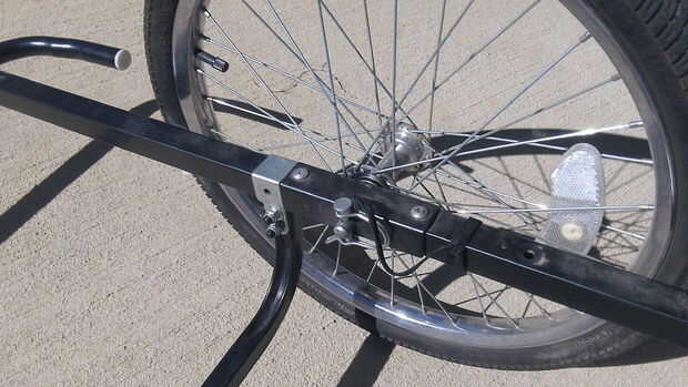 Que trasladó las pinzas al frente del doubler de marco y apretar los tornillos (foto 4). Si tuvieras que abra la abrazadera en el lado izquierdo, puede tomar algún esfuerzo para doblar en forma para alinean los orificios. Me puse la rueda hacia atrás para asegurarse de que nada interfiriera con los radios, pero también hizo más fácil para moverse el remolque mientras que la cubierta (Foto 5).