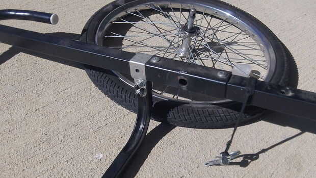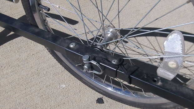 También es un buen momento para sacar las ruedas para que no tenga que luchar contra los radios con la llave allen (Foto 3). En este trailer, se celebra la rueda con un perno que se mantiene en su lugar con un clip. Para obtener la rueda, el clip se voltea, el perno se quita y cae la rueda.