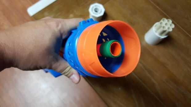 me olvide de tomar una antes de imagen. El barril de blastzooka tiene un pequeño agujero en el lateral para que el aire se escape. Para obtener el flujo de aire máximo para esto, usted necesita cortar la punta. Empezar por remover el anillo naranja de la parte delantera de la blastzooka. Debe simplemente pop apagado con un poco de esfuerzo. Esto le dará suficiente espacio para cortar la punta. Comencé en el agujero y corte alrededor del cañón hasta que salió de la punta. Usé un cuchillo de bolsillo para esto, pero una sierra funcionaría igual de bien. (si has visto, utilice un cuchillo o un archivo para limpiar los bordes). Una vez que se corta la punta, envuelva el cañón en cinta aislante hasta que el reductor de 1/2" buje cabe firmemente en el barril.
