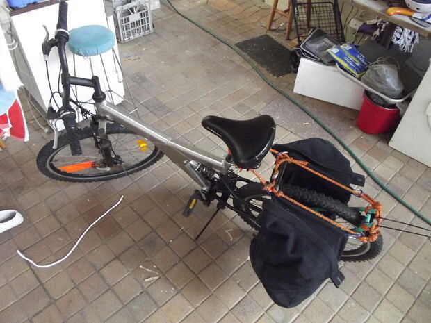 Había pensando en el transcurso del día cómo hacer alforjas bicicleta, muchas ideas vinieron a mí, quizás podría utilizar dos mochilas, pero por desgracia, sólo tengo una mochila, quizás podría utilizar dos gaitas, pero no tengo gaitas, así que ahí va esa idea. Pude comprar algunas maletas real, pero no tengo esa cantidad de dinero.