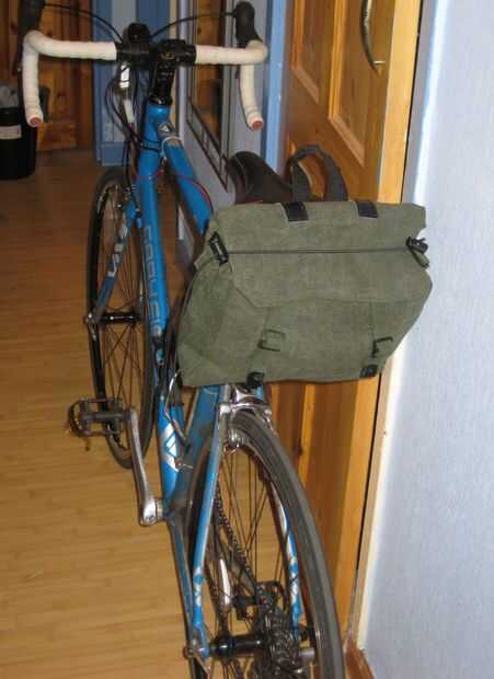 Me he basado esta vagamente en mi Carradice y el bolso más barato en que pude poner mis manos. La bolsa es básicamente lo suficientemente grande como para llevar mi equipo de viaje, una camiseta, ropa interior, toalla y sándwiches.