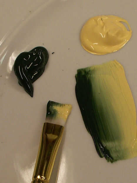 Doble se carga el pincel con matorral y girasol, pintura de esmalte de arte popular. Estos dos colores se utilizará para la pintura de las hojas en su botella.