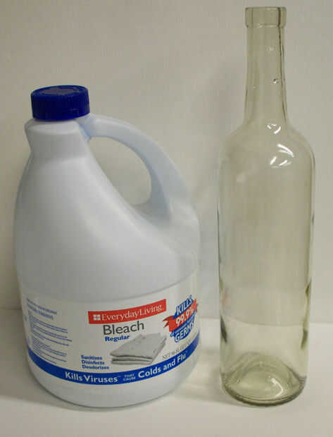 Vierta una pequeña cantidad de cloro en la botella. Añadir un poco de agua y agítelo alrededor de todo el interior de la botella.