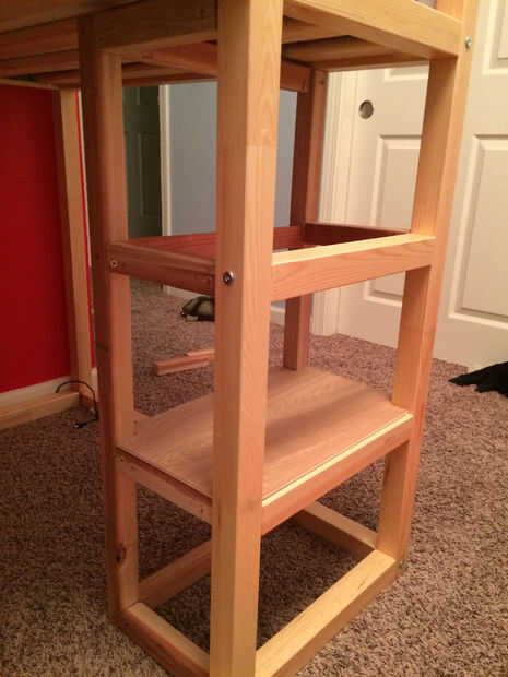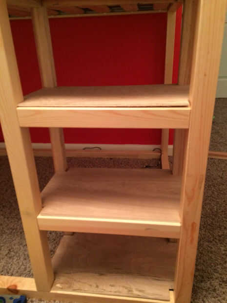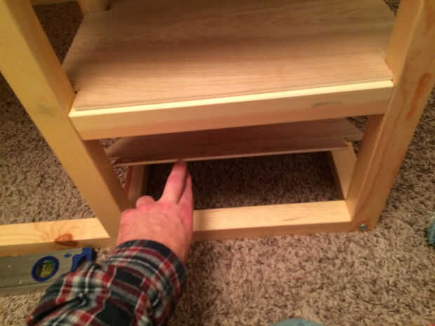 Con eso hecho, es hora de voltear la cama de nuevo a su posición original. Medir la longitud/la anchura de los pasos recién creados. Cortar las bases del paso de la madera contrachapada y muesca en pulgadas de 1 x 1 en todas las esquinas. Debe poder apretarse bien. Corté el inferior un poco flojo a propósito. Esto es donde mi hijo puede ocultar su "tesoro secreto" de su hermana.