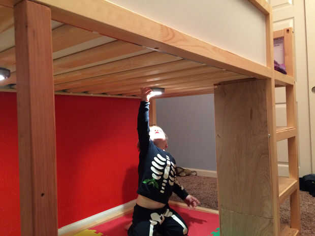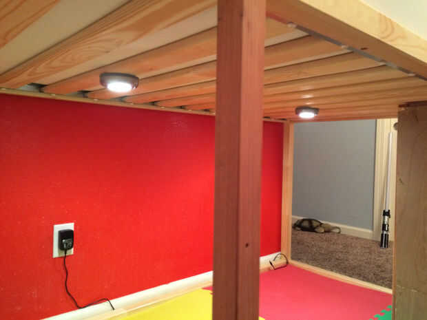 Coge las dos luces de puck y sujete a la parte inferior de la cama. Utilicé tornillos pequeños pero Velcro o imanes funcionaría igual de bien
