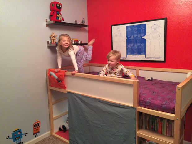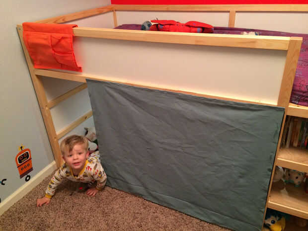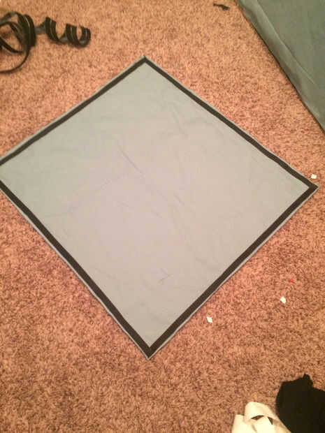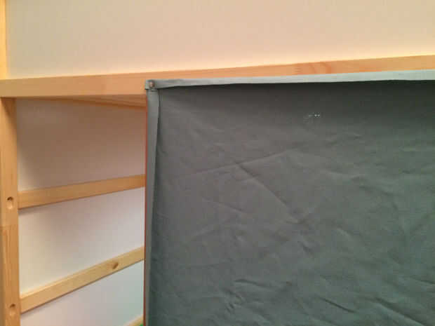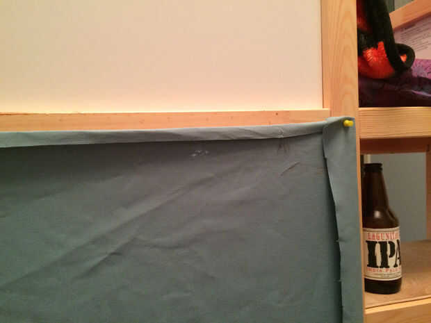 Cortar los dos cuadrados para que coincidan con las aberturas a cada lado que intenta cubrir. Añadí una pulgada en todos los lados que puedo doblarlas hacia atrás y hacer una especie de alcantarillas no hem. Yo viramos a la tela sobre las aberturas con chinchetas y luego dobla hacia donde yo quería. Entonces usé puntada líquida para "hem" en su lugar. Cuando estaba seca utilicé cinta con respaldo de Velcro para añadir al marco de la cama y a la tela.