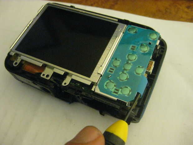 El material azul en esta imagen contiene los botones que se utilizar para interactuar con la cámara. Está conectado a la placa de circuito principal de la cámara a través de dos "cables de cinta"--poco las fichas que contienen un montón de alambres finos. Para poder llegar a sensor de la cámara, tenemos que desconectar una de estas fichas de cable de cinta--que en la "parte inferior derecha" de la cámara (se muestra).