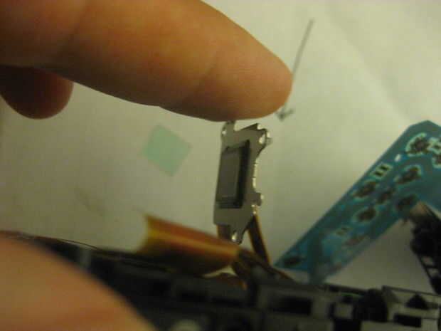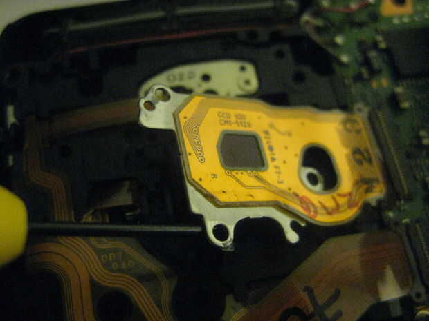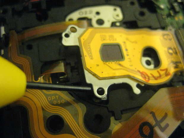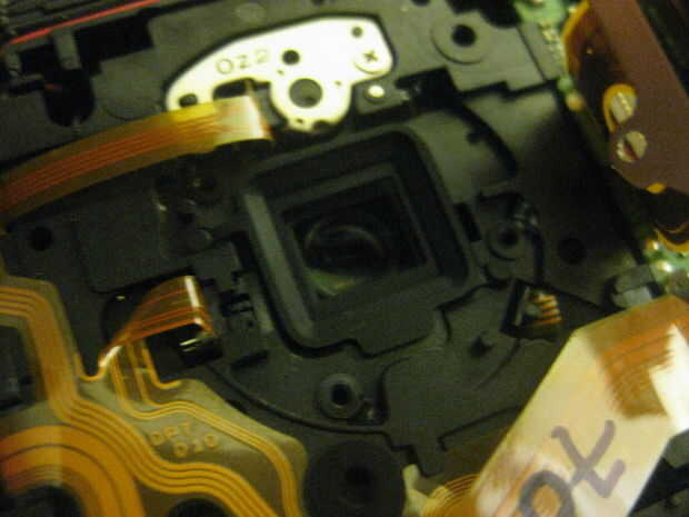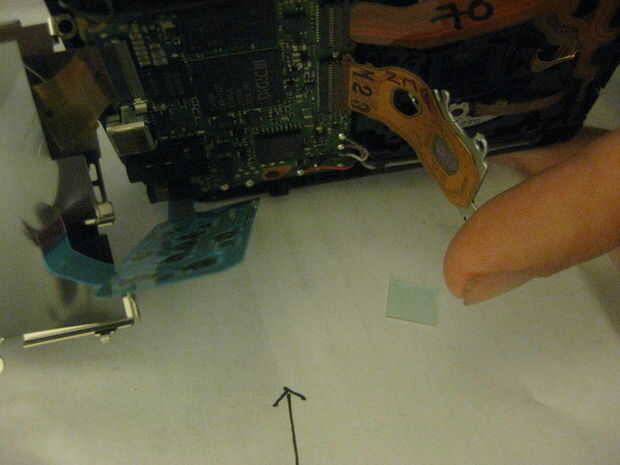 Levantando un poco la Junta de goma (pero tratando de no eliminarlo), gire la cámara a su lado y sacuda el filtro de bloqueo infrarrojo. Es una pieza pequeña y rectangular que parece vidrio teñido de azul.