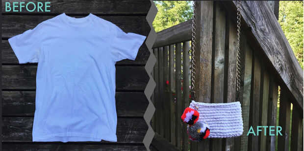 Cuando vimos el concurso de "antes y después", estábamos extasiados. Nos encanta hacer bolsos de ganchillo y nada mejor para un crocheter que ahorro en hilo. Este hack convierte una vieja camiseta en un accesorio moderno. Puede usar cualquier camiseta que tienes ahí, o conseguir uno en la tienda del dólar (que es lo que hicimos). Asegúrese de que el tamaño es por lo menos un medio por lo que tendrás suficiente hilo de una camiseta para hacer el monedero.