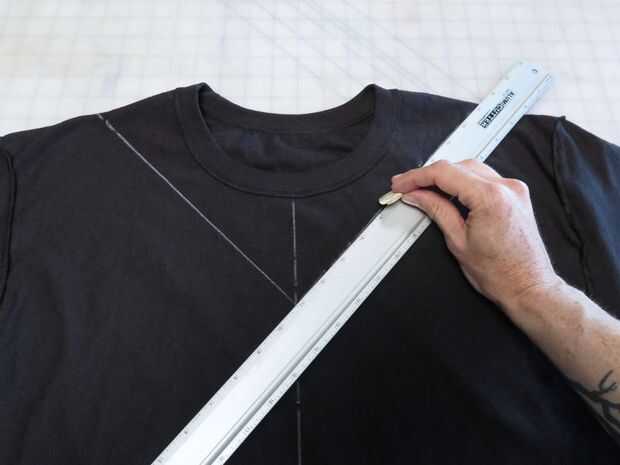 Vuelva la camiseta primero de usar su regla y tiza para marcar una línea hacia el centro del delantero.