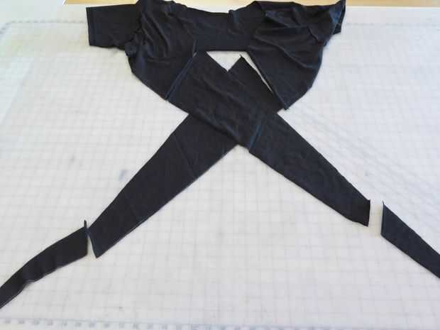 La porción restante de la parte inferior de la camisa, crear piezas para extender los lazos hacia fuera desde el centro del delantero en dos secciones en cada lado.