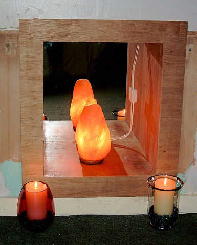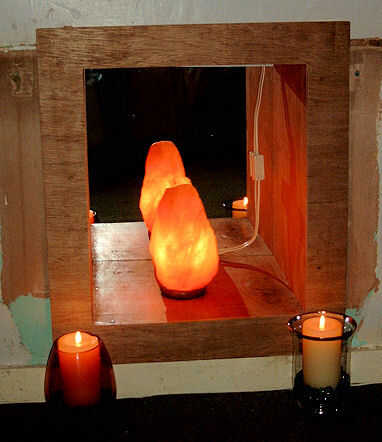 Hemos probado esta noche primero con las velas luego una lámpara que dan una sensación muy cómoda a la sala, la lámpara de la opción es un pedazo de 10lb de sal de cristal en una especie de durazno color naranja y realmente pone en marcha los tonos en la madera muy bien.