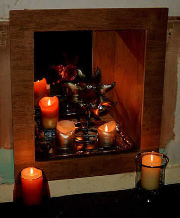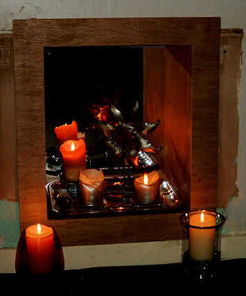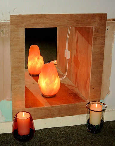 El plan original era para azulejos de espejo a los lados para reflejar la luz y el calor de las velas pero ahora he visto cómo las miradas de la lámpara apenas puedo línea con espejos extraíbles para los tiempos utilizan velas y dejan la madera llano el resto del tiempo.