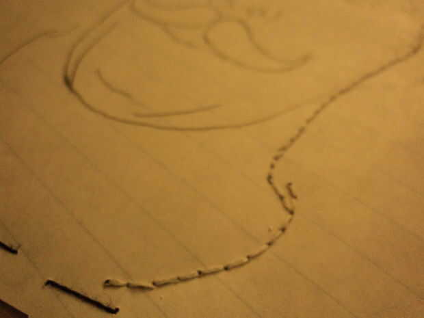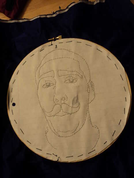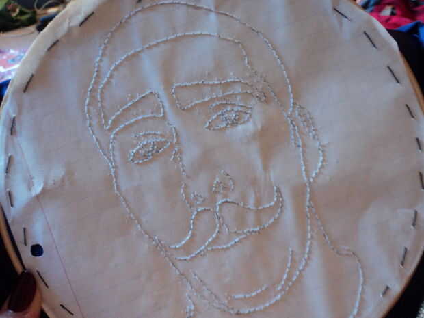 Siguiendo las líneas de su patrón, asegurándose la puntada a través del papel y la tela. Usé dos hebras de un hilo para bordar bordado 6 hebras y acabo de hacer una simple puntada atrás. Si usted necesita algunas formas básicas de bordado, hay muchas otras buenas guías, como este: