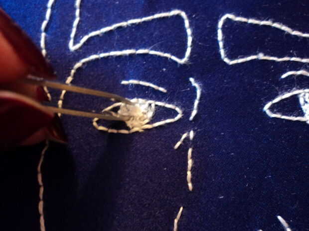 Una vez que ha cosido sobre su patrón de todo, sacar las puntadas grandes sosteniendo el papel a la tela y luego rasgar suavemente el papel del diseño han cosido. Puesto que las puntadas han perforado el papel, puede rasgar apagado bastante fácilmente, pero todavía tenga cuidado de no tirar demasiado de los puntos de sutura. Para áreas más pequeñas puede que necesite utilizar pinzas para obtener trozos pequeños de papel hacia fuera.