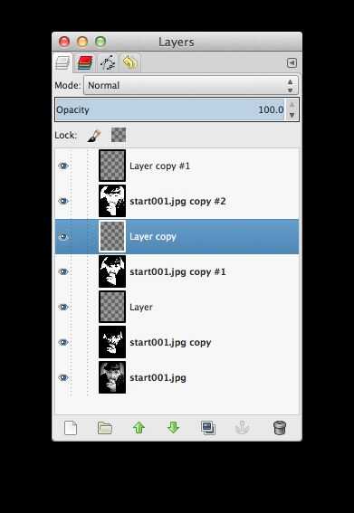 Antes de que utilicemos esas capas de Portilla, volver a la imagen que desea convertir a las escotillas. Seleccione la capa superior y hacerlo visible (es decir: haga clic en el icono "ojo" al lado de la capa y asegúrese de que es visible, lo sabrás porque será la capa sólo se puede ver). Ahora, haga clic en el primer botón a la izquierda del cuadro de diálogo de capas, que es la "nueva capa" botón. Si simplemente presiona retorno cuando la "nueva capa" cuadro de diálogo aparece, obtendrá una nueva capa en blanco en la parte superior de todas las capas. Seleccione esa capa y haga clic en el botón "Duplicar capa" dos veces. Ahora debería tener algo como la segunda imagen, arriba.
