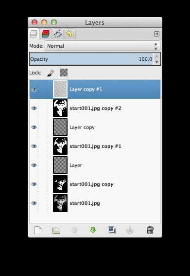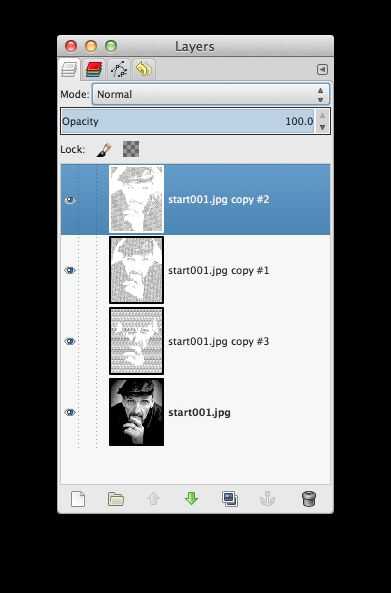 6. Repita los pasos 1-5 para las otras capas de la dos imagen, pero como hacerlo, usar una capa Portilla diferentes para cada capa de umbral. La capa superior que hiciste tiene marcas Portilla corriente diagonal inferior izquierda a superior derecha. Cuando termines, tendrás 3 capas y la capa de base en el diálogo de capas, como la imagen #5, arriba.