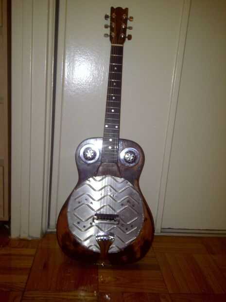 La primera foto es el resonador acabado, el segundo lo empecé con (me olvide de tomar una foto de la guitarra real antes de cortar para arriba!). Las cubiertas de boca son drainhole cubiertas, la cubierta está hecha de una vieja bandeja de plato de metal y las cubiertas del puente son dos manijas del cajón. Wimped hacia fuera en la configuración de mi resonador cono/galleta puente y cordal y apenas compré barato en línea. También compré un pastilla piezoeléctrica barato que podría ampliarse el resonador.