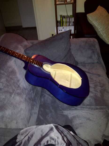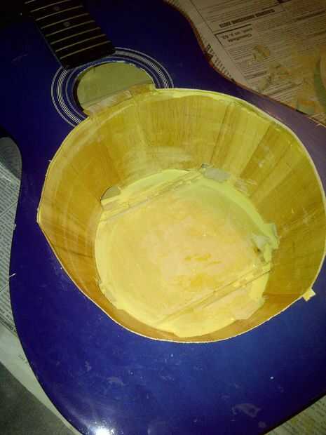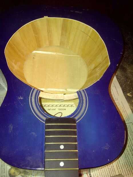 Corté unos arcos en la parte inferior de la "soundwell" para que algo de ruido podría escapar al resto del cuerpo de la guitarra. Después de montar en, apliqué una dosis pesada de cola para madera para sujetar en su lugar