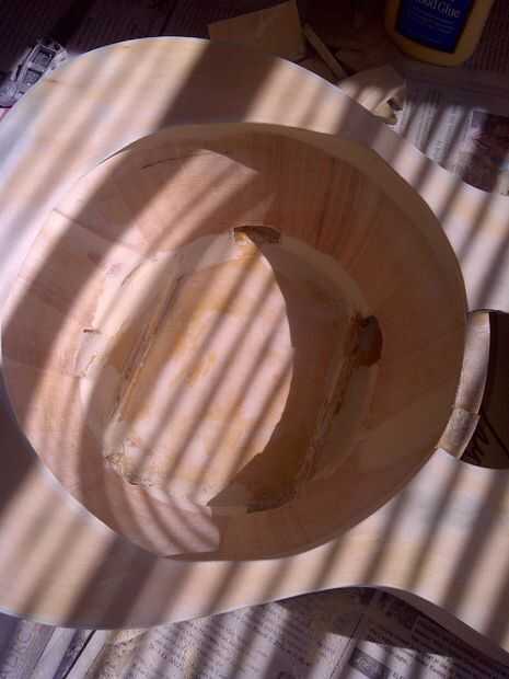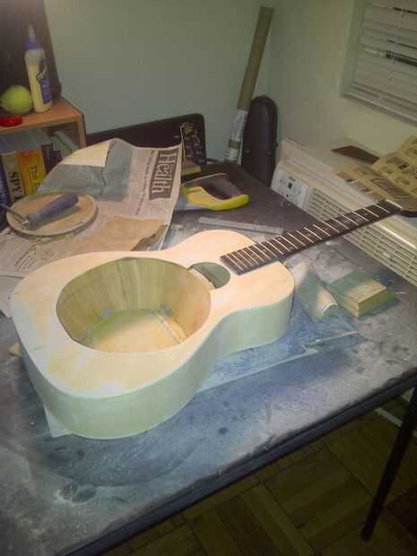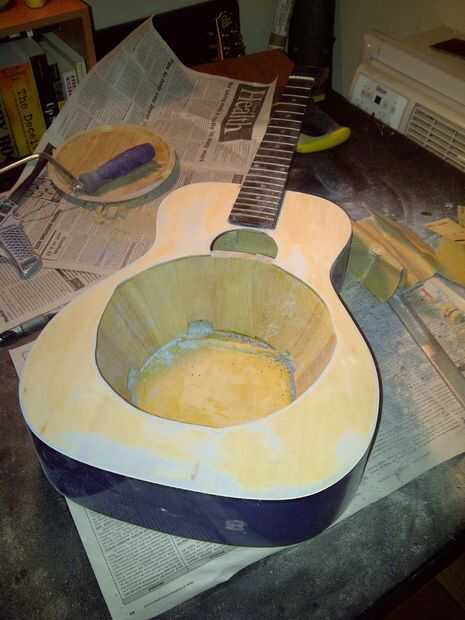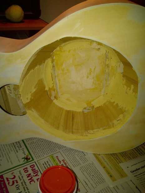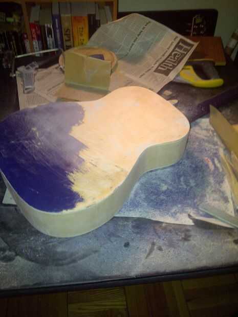 Después de que el pegamento para el soundwell había secado lo suficiente, enarenada apagado la pintura azul pegajosa para que la guitarra sea liso y listo para una nueva mancha abajo de la línea. También se aplica una dosis pesada de masilla de madera para cubrir las juntas entre las dos piezas de la soundwell y las brechas entre el soundwell y el cuerpo de la guitarra. Para el lijado he utilizado diferentes granos de lija y una escofina de madera fiel.