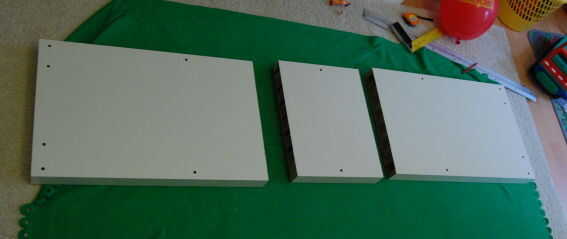.. .es para cortar la parte superior (1) en tres partes. Miden 60 cm de la izquierda y cortarlo. Miden 60 cm por la derecha y cortar otra vez. Debería verse como en la imagen ahora. Whoaw... que era difícil ;-)