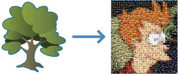 Para cada píxel de la imagen redimensionada, encontrar las imágenes con un color similar. Esto se hace por convertir los píxeles en espacio de color LAB y luego utilizando la estructura de datos para encontrar colores cercanos. La búsqueda de una radio puede usarse para encontrar todas las imágenes de cerca el color deseado dentro de una cierta distancia. Si no colores existen después de hacer esto, se puede hacer una búsqueda de vecino más cercana para encontrar el más cercano. Para evitar la repetición, eligió una imagen al azar de estos candidatos para representar a los píxeles.