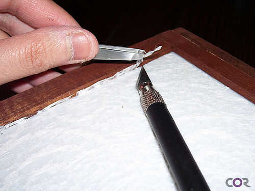 a veces no es posible deslizar la regla en. Así que usar cuchillo XActo como otra manera de. La razón de que no hacer esto en primer lugar es porque no quiero a riesgo de dañar la madera o el plástico. Utilice unas pinzas para quitar el exceso de papel.
