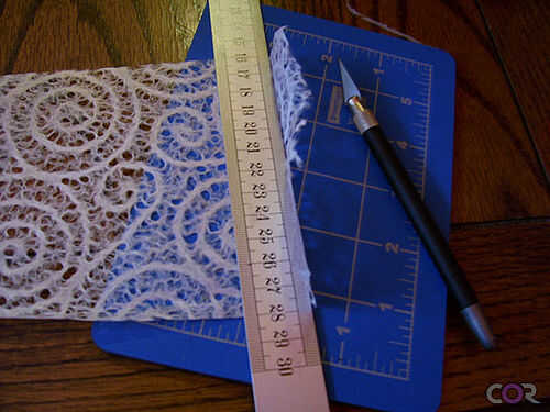 Después de doblar, cortar con cuchillo X-acto. Doblar y recortar un lado, doblar y recortar de otro lado. Al podar, añadir un poco más papel, unos 1-3 cm. (sí, es cierto, yo soy americano y dije centímetros). Usted verá por qué.