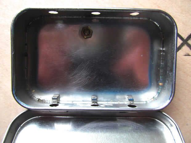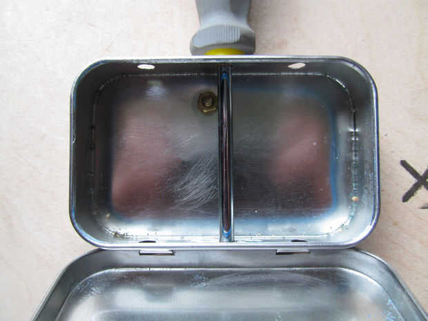 -Superglue los imanes detrás de los agujeros en el lado de la lata con las bisagras. Esto evitará que los destornilladores resbale hacia fuera accidentalmente.