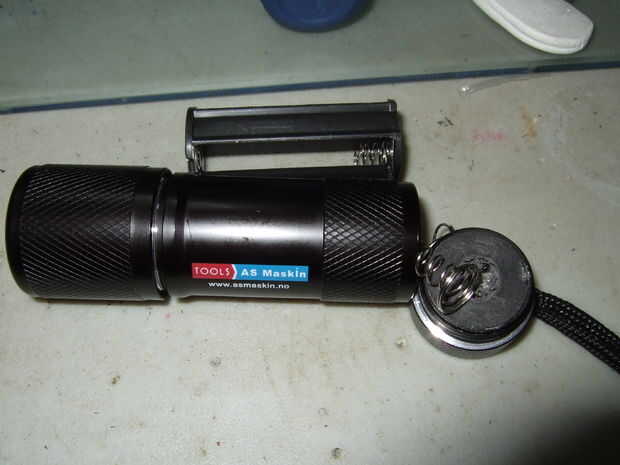 La tapa inferior de la linterna contiene una primavera y un espaciador de plástico. Quité el resorte girando hacia fuera tirando en él. Salió bien. He probado a meter de nuevo en la imagen, pero no quería cooperar. Para estar prevenido que este podría ser el punto de no retorno.
