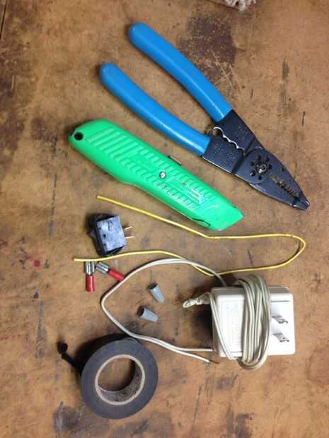 Necesita: Luminaria emergencia LED Olmo-2 un transformador de 9v, pequeño interruptor, un pedazo corto de alambre, 2 conectores hembra de horquilla, 2 capuchones, cinta aislante, cortadores de alambre, navaja, un taladro o Dremel herramienta.