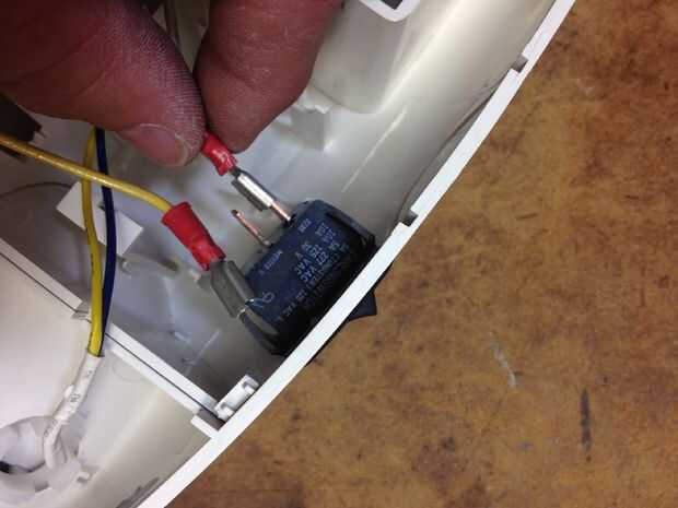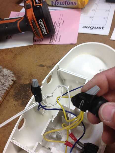 Corte el extremo de enchufe en el transformador. Tira de los 2 cables. Luego coloque uno de los conectores de espada sobre un alambre. Ahora fíjelo al interruptor. El pedazo corto de alambre en ambos extremos de la tira. Acople un conector de horquilla a un extremo. Entonces conecte esa espada en el conmutador. Conecte el otro extremo de los cables amarillos van a ambas bombillas LED con una tuerca para alambre. A continuación, conecte los cables azules al otro cable del transformador con una tuerca para alambre. Envuelva las tuercas de cable con cinta aislante.