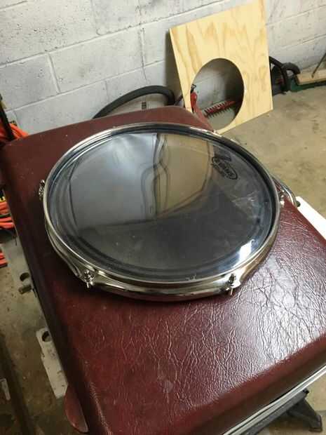 Tomar el círculo de madera y poner en el interior de la maleta alrededor del orificio. Perfore los agujeros que ha perforado en el borde de la madera en la maleta. Listo tu cabeza del tambor con el anillo que hiciste en el borde del tambor y alinee los orificios de tornillo en el borde del tambor y la maleta. Empezar en espigado hasta que es robusto.