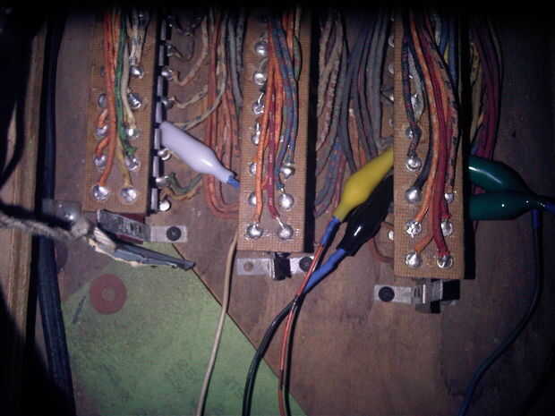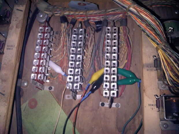 Una vez que se identifica cada par, clip pinza cocodrilo a la zapata en el extremo hembra del conector jones y ejecutar nuevamente el cable a la placa de relé. T guardar unos cables NOTA en mi máquina todo de la calificación, así como la bola volver, utilice un cable amarillo común así que hizo una conexión en el conector de Jones y partirlo al lado de cada uno de los cuatro Relais.