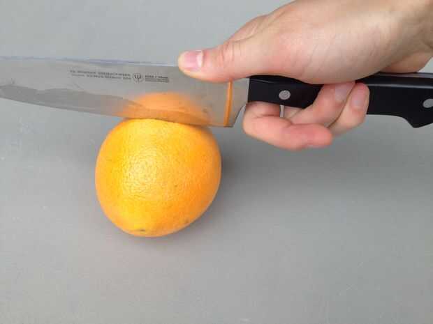 Lentamente con un cuchillo de cocina, corte todo el camino alrededor del centro de la naranja. Sólo necesitas cortar piel profunda.