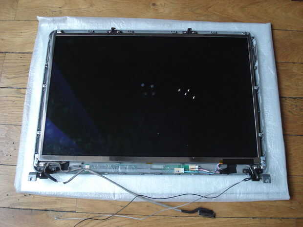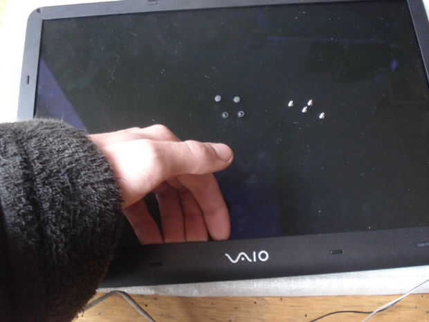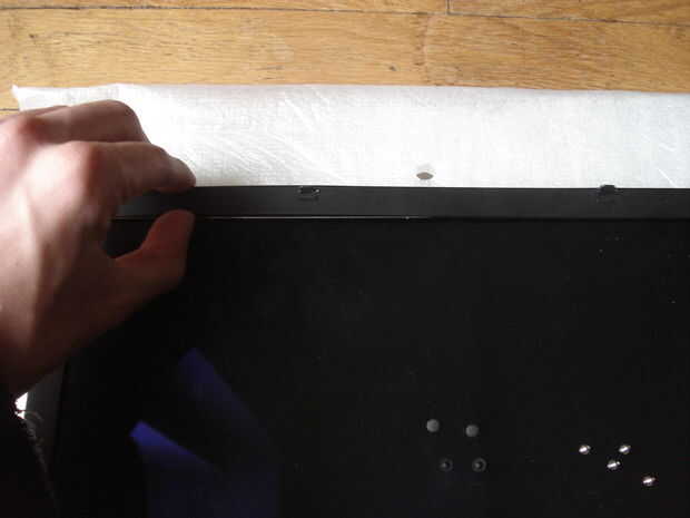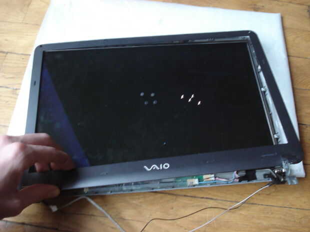 Seguir la pantalla lentamente, manteniendo los dedos debajo de la estructura. Debe oír pequeños "Predescargado" cuando quita el marco. Luego hacer lo mismo en la parte superior y laterales de la carcasa (fotos 2 y 3). Ser muy suave, no a romper uno de los clips que sujetan el marco, como lo hice: necesitaremos. Ahora puede tomar el marco de la (foto 4).