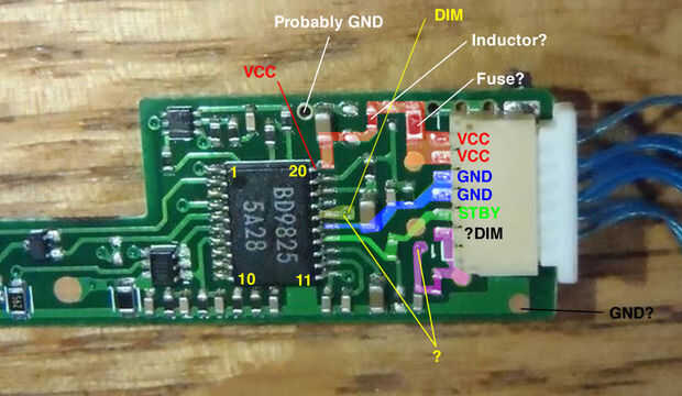 Los otros pines de activar/en espera ajustar/Dim deben ser rastros más delgados que sale de la IC y probablemente contiene una red de resistencia/condensador, para que sea más sencillo sólo tienes que seguir los rastros de la Junta, si los rastros termina en un componente, seguir el rastro después de las resistencias (negro unos, con 3 dígitos en él) no los condensadores (más amarillento), probablemente va a terminar los capacitores a tierra.