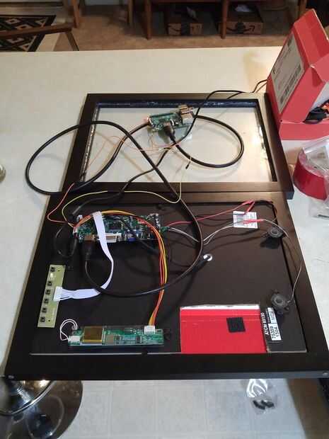 Yo todo lo había conectado a la tarjeta controladora, el cable de datos y cables de alimentación de luz de fondo de la pantalla y potencia del inversor y el botón de botón de menú. Le enchufamos la fuente de alimentación de la tarjeta controladora en y el cable de HDMI de la Raspberry Pi. El Raspberry Pi fue impulsado de un cargador USB, a pesar de que sabía que iba a cambiar más adelante. Yo quería probarlo para asegurarse de que todos trabajaban.