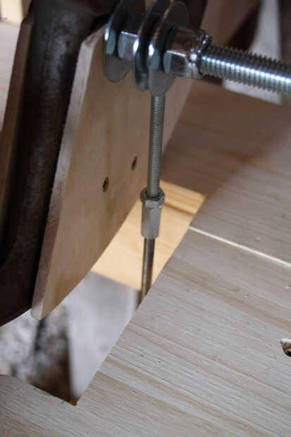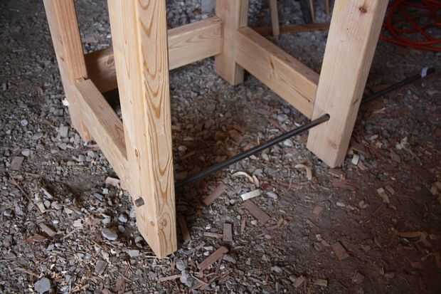 Para instalar el pedal, perforar 2 paralelo 1/2" a través del espacio abierto frente en la tabla de herramienta. Pongo mis 4 1/2" de la tierra basada en lo que era cómodo para mí. Esta es la altura a la que girará el pedal. Verifique que la barra de acero encajará limpiamente a través de los agujeros (Foto 1). Cortar la barra de acero con una sierra para metales. Dejo mis sobresalen sobre una media pulgada en cada lado de las patas de la mesa.